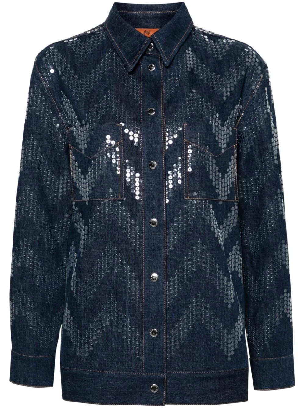sequin-embellished denim jacket Missoni lends the classic denim shirt a sophisticated appeal. This iteration is embroidered with sequins, creating a pattern reminiscent of the brand's signature zigzag motif. Highlights - Indigo blue - Cotton - Denim - Contrast stitching - Chevron sequin embellishment - Spread collar - Front press-stud fastening with logo studs - Drop shoulder - Long sleeves with press-stud fastening cuffs - Straight hem - The item you receive may differ slightly from the item photographed. this is due to the artisanal nature with which all missoni products are constructed. Made in Italy Composition Polyester 100%, Cotton 100% SIZE & FIT Model measurements Height 5 ft 10 in(1.79 m) Bust/Chest 31.49 in(80 cm) Hips 35.03 in(89 cm) Waist 23.62 in(60 cm) FittingInformation Designed for a relaxed fit, this piece allows for comfort and movement when worn Made from a midweight non-stretch fabric This piece fits true to size – take your usual size Washing instructions Machine Wash