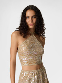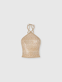 Top in lamé viscose with lace motif, sequins, and halter neckline