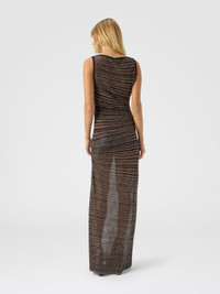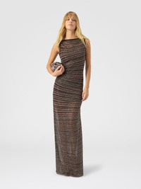 Sophisticated elegance and modern refinement meet in this long women’s dress with a boat neckline. The viscose-blend striped knit, enriched with lame threads and sequins, discreetly captures the light, creating a luminous effect that gracefully wraps the silhouette. A garment that blends modernity with timeless class, perfect for any elegant occasion. MORE DETAILS - Long dress - Sleeveless - Boat neckline - Striped knit - Lurex threads and sequins - Viscose blend Composition: EXTERNAL:70%Rayon, 23%Polyamide, 7%Metal Fiber Care instructions: Ironing maximum temperature 110°C - without steam ; Dry cleaning in tetrachloroethene - mild process ; Wash in net bag ; Dry flat ; Iron inside out ; Do not tumble dry ; Dry inside out ; Do not wash ; Do not bleach Made in: Italy Product ID DS25WG12BK01CLS80E3