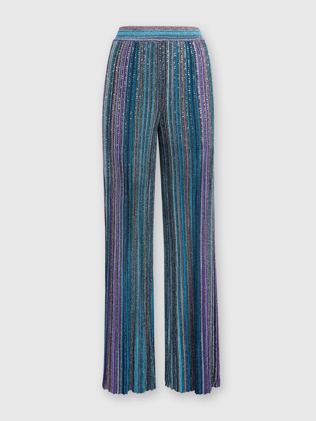 The particular partialized workmanship, which infuses the shirt with a pleated effect, embellishes the palazzo pants with elastic waistband. Crafted from a lame viscose blend, the garment is illuminated by a shower of applied sequins. MORE DETAILS - Pantapalazzo - Elastic waistband - Ribbed work - Application of sequins Composition: EXTERNAL:41%Rayon, 21%Metal Fiber, 19%Polyamide, 19%Polyester; LINING : 82%Polyester, 18%Elastane Care instructions: Dry cleaning in tetrachloroethene - mild process ; Ironing maximum temperature 110°C - without steam ; Hand wash ; Wash in net bag ; Iron inside out ; Do not tumble dry ; Dry flat ; Do not bleach Made in: Italy Product ID DS24WI0QBK039ESM9G9