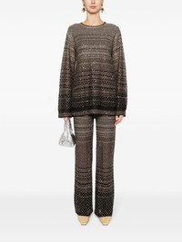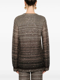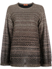 sequin-embellished striped jumper Woven with metallic fibre and sequins, this jumper captures Missoni's love for gleaming designs. It's made in Italy with a mesh-like knit technique, featuring soft stripes that echo the brand's iconic aesthetic. Highlights - Black/gold-tone - Knitted construction - Metallic threading - Horizontal stripe pattern - Embroidered design - Sequin embellishment - Crew neck - Long sleeves - Ribbed cuffs and hem - Short side slits - Straight hem - The item you receive may differ slightly from the item photographed. this is due to the artisanal nature with which all missoni products are constructed. Made in Italy Composition Viscose 55%, Polyamide 25%, Polyester 15%, Metallic Fibre 5% Washing instructions Hand Wash