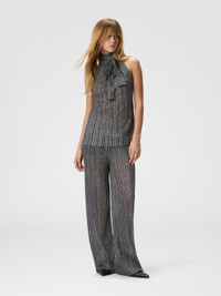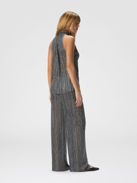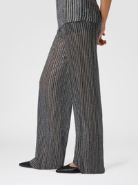 A sequin-covered surface defines these long women’s trousers in partially open knit, creating a continuous, radiant effect that reflects light with refinement. Made from a viscose blend with lame threads, they feature an elasticated waist for comfort without compromising on style. The partial knit adds depth and visual rhythm to a garment designed to stand out with contemporary allure. MORE DETAILS - Women's long trousers with elastic waist - Partial knit - Viscose blend - Lame filaments and sequins Composition: EXTERNAL:78%Rayon, 17%Polyamide, 5%Metal Fiber; LINING : 82%Polyester, 18%Elastane Care instructions: Ironing maximum temperature 110°C - without steam ; Dry cleaning in tetrachloroethene ; Wash in net bag ; Dry flat ; Do not tumble dry ; Iron inside out ; Wash separately ; Reshape when damp ; Do not wash ; Do not bleach Made in: Italy Product ID DS25WI19BK01FWSM9WP