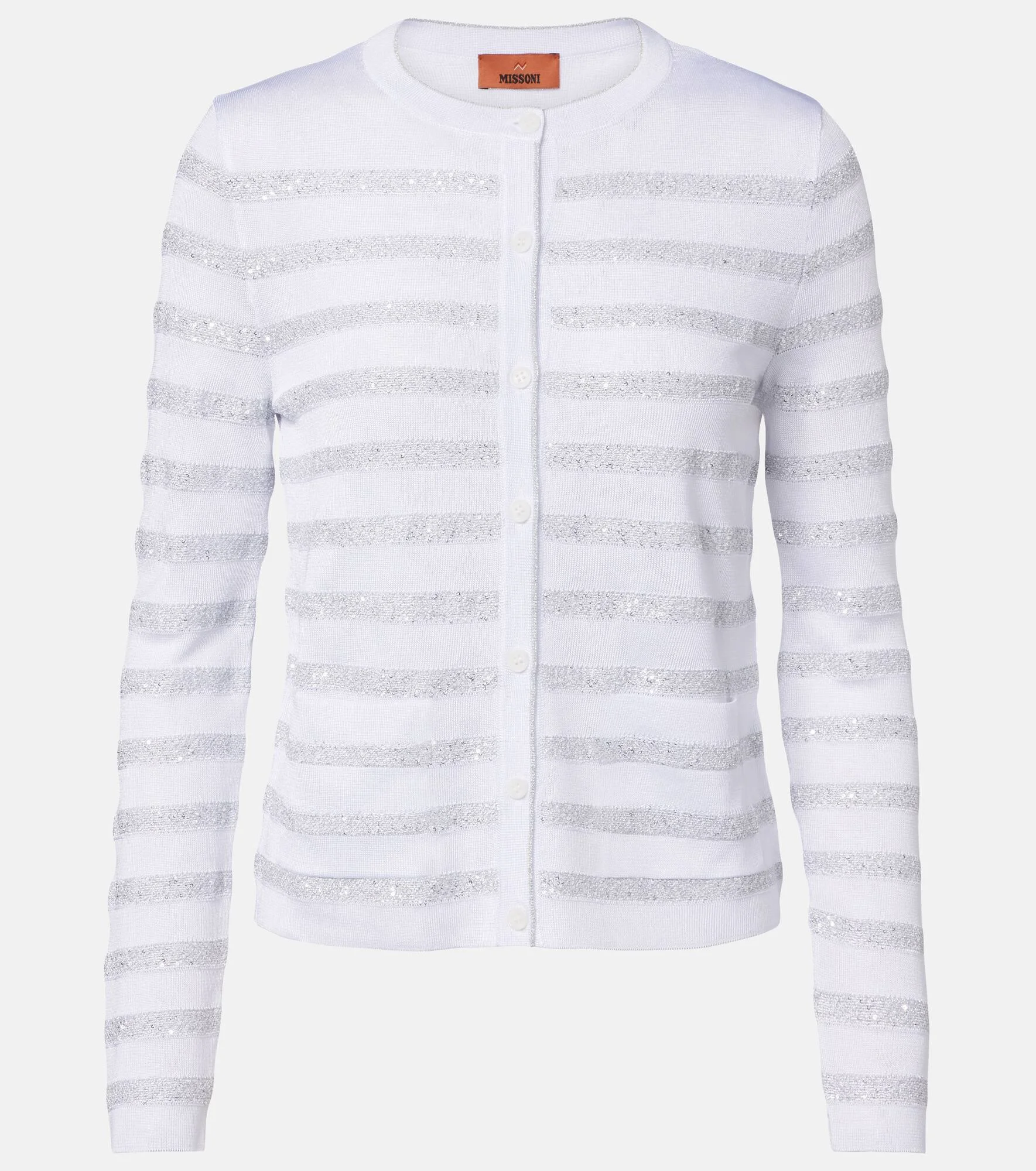 Missoni’s craftsmanship, iconic patterns, and bold color palettes bring a sense of sophisticated joy to dressing. This lightweight cardigan is defined by a sequined striped pattern, adding a touch of sparkle to the look. Product Details - Material: 80% viscose, 18% polyamide, 2% metallic fibres - Care instructions: hand wash - Made in Tunisia - Color: white - Designer color name: White And Silver Tones - Closure: buttoned front - Item number: P01108664 Size & Fit - True to size - Straight fit - Non-stretchy fabric - Falls to the hip - The model seen in the picture is 178cm-5'10" and wearing a size IT 38