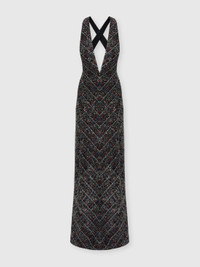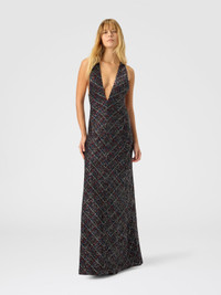 Covered in elegant sequins, this long V-neck dress with criss-cross back straps evokes bold, sophisticated femininity. Made on a Caperdoni loom, the fabric features an embroidered check pattern reminiscent of the iconic zigzag, enhanced with lame threads for a discreet shine. The fluid silhouette and rear strap design create a play of lines that flatter the figure with elegance—perfect for a high-style evening. MORE DETAILS - Long dress with deep V-neck - Cross-back straps - Caperdoni framework weaving - Check pattern - Viscose blend - Lame filaments and sequins Composition: EXTERNAL:78%Rayon, 11%Polyamide, 6%Metal Fiber, 5%Polyester; INTERNAL REINFORCEMENT:100%Polyester; LINING : 82%Polyester, 18%Elastane Care instructions: Hand wash ; Steam iron only ; Dry flat ; Do not tumble dry ; do not soak ; Do not dry clean ; Do not iron ; Do not bleach Made in: Italy Product ID DS25WG3MBC005VS91R4