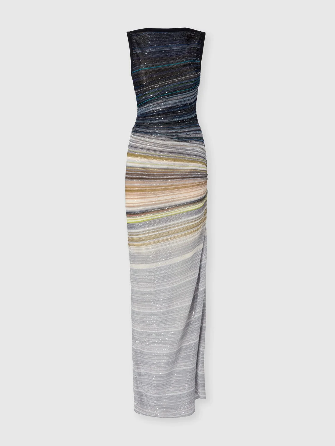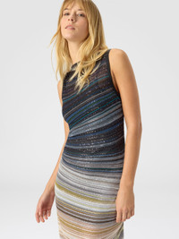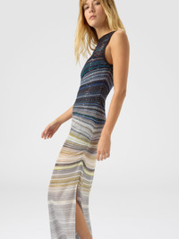 Sophisticated and lightweight, this sleeveless women’s boatneck long dress embodies essential elegance with strong visual impact. Made from partially open striped knit in viscose blend, it’s enriched with lame threads and sequins that animate the surface with subtle luminosity. MORE DETAILS - Sleeveless boatneck long dress - Partial striped knit - Viscose blend with lame filaments and sequins Composition: EXTERNAL:91%Rayon, 8%Polyamide, 1%Metal Fiber; LINING : 82%Polyester, 18%Elastane Care instructions: Dry cleaning in tetrachloroethene - mild process ; Ironing maximum temperature 110°C - without steam ; Hand wash ; Wash in net bag ; Do not tumble dry ; Dry flat ; Wash separately ; Reshape when damp ; Do not wash ; Do not bleach Made in: Italy Product ID DS25WG3OBK01FJSM9WR