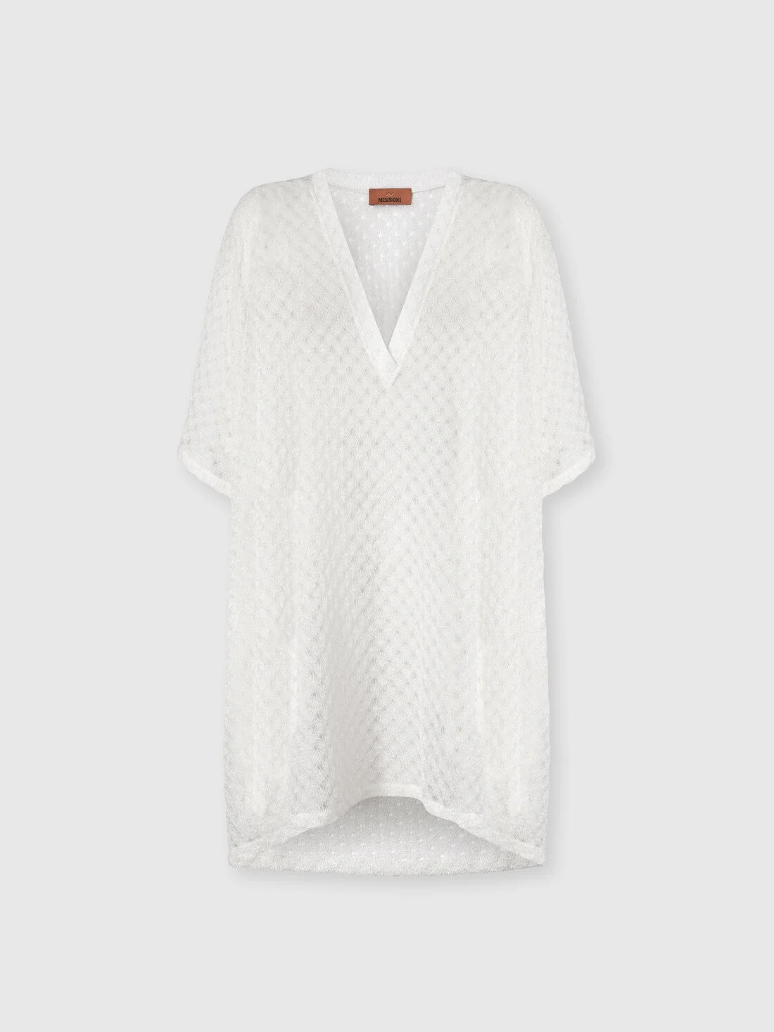 MORE DETAILS - Women's short beach cover-up kaftan - V-neckline - Raschel knit - Spiderweb pattern - Viscose lame Composition: EXTERNAL:83%Rayon, 17%Metal Fiber Care instructions: Ironing maximum temperature 110°C - without steam ; Dry cleaning in tetrachloroethene ; Do not tumble dry ; Do not wash ; Do not bleach Made in: Italy Product ID MC26SQ00BR014RS01JW