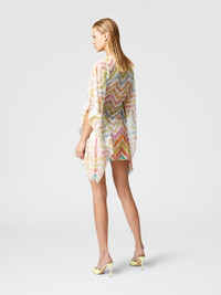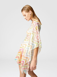 Short cover-up kaftan in printed tulle, with wide sleeves that give fluidity to movement. The see-through fabric creates a light and sophisticated effect, offering a refined and comfortable design for any summer occasion. MORE DETAILS - Short model kaftan - Tulle Printed - Wide sleeves - Zig zag pattern Composition: EXTERNAL:100%Polyester Care instructions: Ironing maximum temperature 110°C - without steam ; Dry cleaning in tetrachloroethene ; Do not tumble dry ; Do not wash ; Do not bleach Made in: Italy Product ID MC23SQ03BR010XSM9N4
