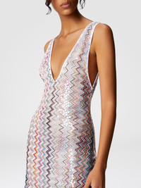 Radiant elegance for the beach. This short cover-up, made in Raschel craftsmanship, is embellished with sequin details that catch the light with every movement. The deep V-neckline, both front and back, adds a seductive and refined touch to the design. MORE DETAILS - Women's short cover-up - V-neckline - Back neckline - Sequin inserts Composition: EXTERNAL:64%Rayon, 36%Polyester Care instructions: Ironing maximum temperature 110°C - without steam ; Dry cleaning in tetrachloroethene ; Do not tumble dry ; Do not wash ; Do not bleach Made in: Italy Product ID MS25SQ2JBR012VSM9QG