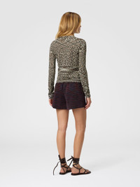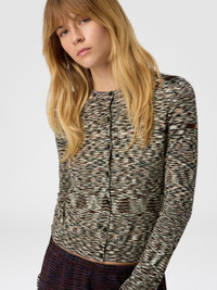 Short crew-neck buttoned cardigan for women, made of slubbed smooth wool blend knit. The compact design and unique knit texture give the garment a distinctive character, ideal for adding a touch of informal elegance to any outfit. MORE DETAILS - Short crew neck cardigan - Flame plain knit - Wool blend Composition: EXTERNAL:97%Wool, 2%Polyamide, 1%Elastane Care instructions: Hand wash ; Dry cleaning in tetrachloroethene - mild process ; Ironing maximum temperature 110°C - without steam ; Wash inside out ; COOL HAND WASH ; Dry flat ; Do not tumble dry ; Iron with a cloth between ; Do not bleach Made in: Romania Product ID DS25WM0JBK01CCFM13X