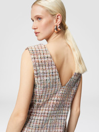 The sleeveless mini-dress, made of a boucle wool and viscose blend with Caperdoni loom workmanship, is innervated by a cascade of sequins that light up the checkered pattern. The result is a V-neckline dress with a front and back that is unlike any other. MORE DETAILS - Sleeveless Mini-Dress - Boucle wool and viscose blend - Caperdoni Loom Processing - Sequined checkered pattern - V-neckline front and back Composition: EXTERNAL:46%Rayon, 26%Wool, 14%Polyamide, 8%Polyester, 6%Metal Fiber; INTERNAL:100%Polyester; LINING : 82%Polyester, 18%Elastane Care instructions: Dry cleaning in tetrachloroethene - mild process ; Do not tumble dry ; Do not iron ; Do not wash ; Steam iron only ; Do not bleach Made in: Italy Product ID DS24WG35BC004RSM9IB