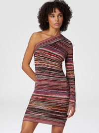 This one-shoulder mini-dress, by Missoni, catches the eye with its lame wave pattern and embossed viscose fabric. The snug fit and asymmetrical cut make it a bold and refined garment, ideal for those who love the house's distinctive style. MORE DETAILS - One-shoulder mini-dress - Embossed viscose lame - Wave pattern Composition: EXTERNAL:79%Rayon, 19%Metal Fiber, 1%Elastane, 1%Polyamide; LINING : 82%Polyester, 18%Elastane Care instructions: Ironing maximum temperature 110°C - without steam ; Dry cleaning in tetrachloroethene - mild process ; Dry inside out ; Do not tumble dry ; Dry flat ; Iron inside out ; Do not wash ; Do not bleach Made in: Croatia Product ID DS25SG0XBK042CS416H