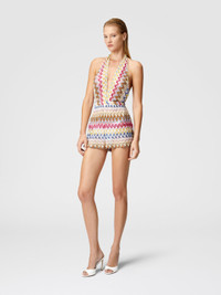 The short jumpsuit in lame viscose lace embodies the bold elegance typical of Missoni. The refined zigzag pattern, illuminated by lame reflections, is combined with a sensual design that highlights the figure. The very deep neckline, combined with the completely uncovered back, creates a play of contrasts between the delicacy of the lace and the seduction of the lines. MORE DETAILS - Short model jumpsuit - Lame viscose lace - Backless - Deep neckline Composition: EXTERNAL:95%Rayon, 5%Metal Fiber Care instructions: Ironing maximum temperature 110°C - without steam ; Dry cleaning in tetrachloroethene ; Do not tumble dry ; Do not wash ; Do not bleach Made in: Italy Product ID MC24SG00BR0000S01FQ