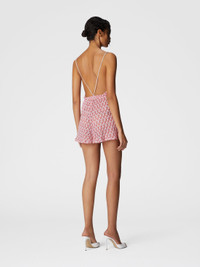 A relaxed short jumpsuit with a deep V-neckline and delicate thin straps that shape the open back. Made from Raschel lace with viscose and lame, it's ideal for a light and sophisticated look. MORE DETAILS - Women's short jumpsuit - Viscose and lame lace workmanship - Open back design - Thin straps Composition: EXTERNAL:90%Rayon, 10%Metal Fiber Care instructions: Ironing maximum temperature 110°C - without steam ; Dry cleaning in tetrachloroethene ; Do not tumble dry ; Do not wash ; Do not bleach Made in: Italy Product ID MC25SG01BR012TS416Y