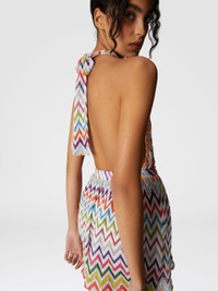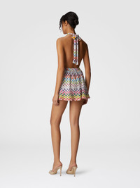 A bold short jumpsuit with a neck tie and an open back. Made from Raschel with viscose and lame, it features the signature zigzag pattern for a fresh and elegant summer look. MORE DETAILS - Women's short jumpsuit - V-neck - Iconic zig zag pattern - Raschel with lame workmanship Composition: EXTERNAL:60%Rayon, 25%Polyester, 15%Metal Fiber Care instructions: Ironing maximum temperature 110°C - without steam ; Dry cleaning in tetrachloroethene ; Do not tumble dry ; Do not wash ; Do not bleach Made in: Italy Product ID MC24SG00BR012RSM9QI