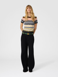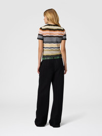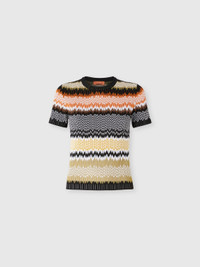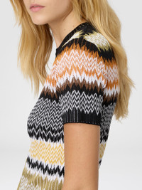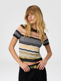 Short-sleeve crew-neck women’s sweater in cotton and viscose blend, embellished with the classic chevron jacquard motif, emblematic of Missoni’s style. The refined workmanship and light texture make it ideal for adding a distinctive and elegant touch to any look. MORE DETAILS - Short-sleeve crew neck sweater - Jacquard knit - Chevron pattern - Viscose and cotton blend Composition: EXTERNAL:53%Cotton, 45%Rayon, 1%Elastane, 1%Polyamide Care instructions: Dry cleaning in tetrachloroethene - mild process ; Ironing maximum temperature 110°C - without steam ; Wash inside out ; Dry flat ; Iron inside out ; Do not tumble dry ; Do not wash ; Do not bleach Made in: Italy Product ID DS25WN0YBK01COSM9SN