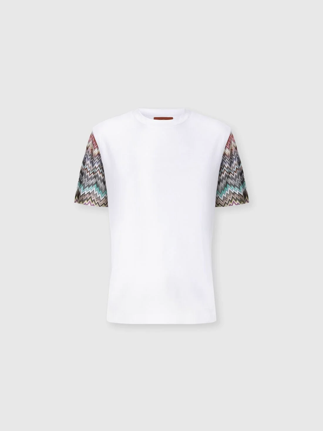 Short-sleeve women’s T-shirt in pure cotton jersey, offered in a solid color with an unexpected twist: the sleeves are enhanced by refined raschel lace with snake motif, adding a graphic and contemporary touch. Essential yet sophisticated, perfect for bold everyday looks. MORE DETAILS - Short-sleeved T-shirt - Raschel snake pattern knit on sleeves - Cotton jersey Composition: EXTERNAL:100%Cotton; INSERTS:100%Rayon Care instructions: Dry cleaning in tetrachloroethene - mild process ; Wash max 30°C - Mild process ; Dry flat ; Steam iron only ; Do not tumble dry ; Do not iron ; Do not bleach Made in: Romania Product ID DS25WL05BJ00PIS01IO