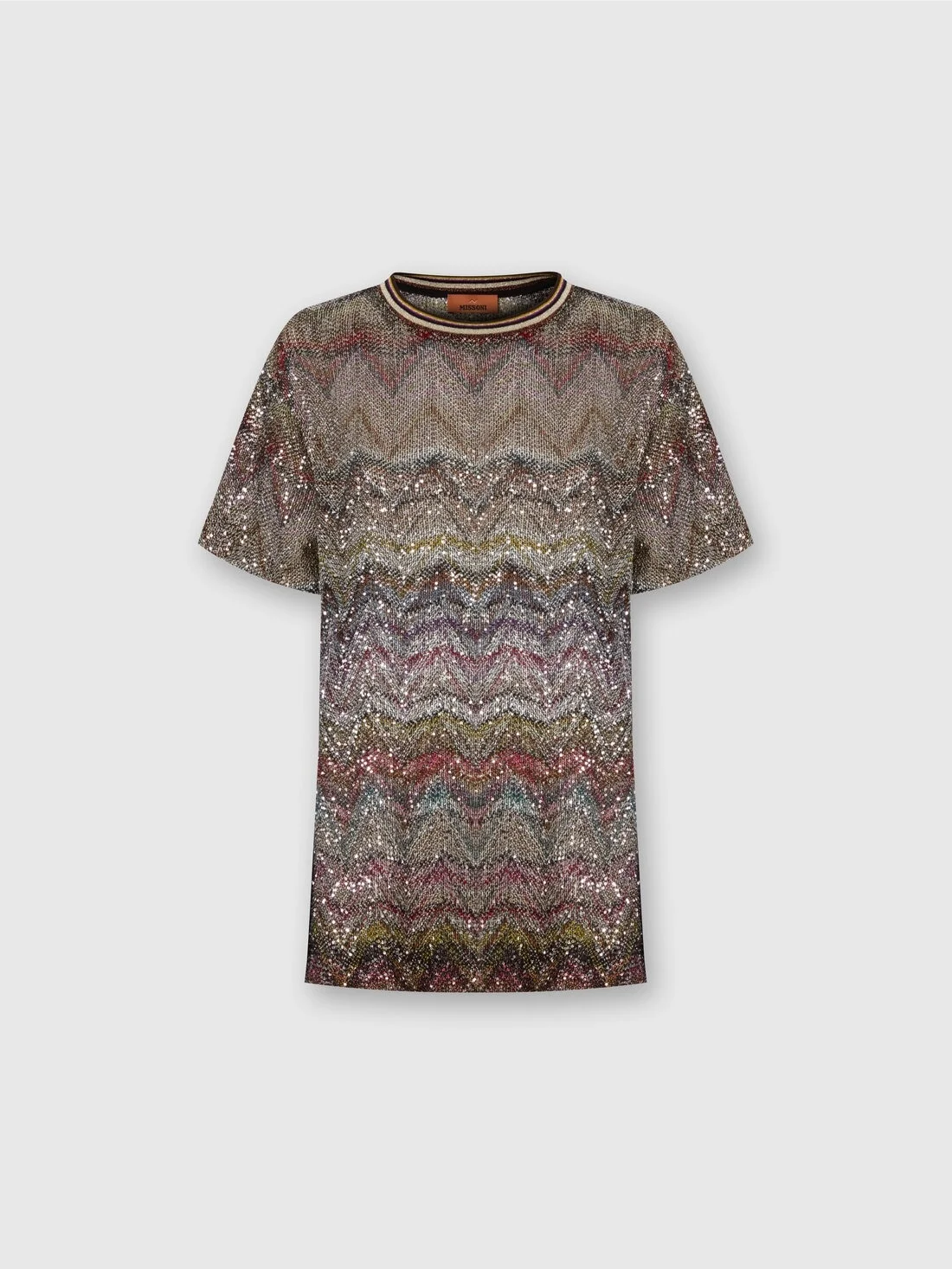 Short-sleeve women’s T-shirt with luminous and sophisticated character, made on a Caperdoni loom with Missoni’s iconic zigzag motif. The lame threads and delicate sequins give the garment a subtle brilliance, perfect for elevating even the simplest looks with a touch of light. MORE DETAILS - Short-sleeved T-shirt - Caperdoni loom knit - Zigzag pattern - Viscose blend - Lame threads and sequins Composition: EXTERNAL:48%Rayon, 46%Polyamide, 6%Metal Fiber Care instructions: Dry cleaning in tetrachloroethene - mild process ; Do not tumble dry ; Dry flat ; Steam iron only ; Do not wash ; Do not iron ; Do not bleach Made in: Italy Product ID DS25WL04BC005GS01HU
