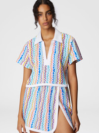 Made from printed terry jersey, this top blends a casual design with iconic details. The V-neck and collar add a classic touch, while the fluid fit ensures comfort. MORE DETAILS - Women's short-sleeve top - Fluid fit - Printed terry cloth fabric - Iconic zig zag pattern Composition: EXTERNAL:100%Polyester Care instructions: Ironing maximum temperature 110°C - without steam ; Dry cleaning in tetrachloroethene ; Do not tumble dry ; Do not wash ; Do not bleach Made in: Italy Product ID MC25SK04BJ00OOSM9QJ