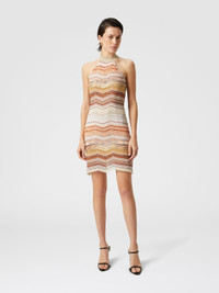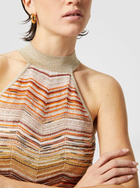 This sleeveless halter neck mini-dress features a lame chevron knit embellished with sequins that give a seductive glow. The sleeveless style and halter neckline emphasize a modern and bold line, revealing Missoni's sartorial mastery in combining fine materials with contemporary designs. MORE DETAILS - Long dress - Chevron Processing - Lame filaments - Decorative Sequins - Neck strap Composition: EXTERNAL:79%Rayon, 10%Metal Fiber, 6%Polyamide, 5%Polyester; LINING : 82%Polyester, 18%Elastane Care instructions: Dry cleaning in tetrachloroethene - mild process ; Ironing maximum temperature 110°C - without steam ; Wash in net bag ; Wash inside out ; Iron inside out ; Do not tumble dry ; Dry flat ; Do not wash ; Do not bleach Made in: Italy Product ID DS25SG23BK045DSM9MH