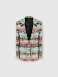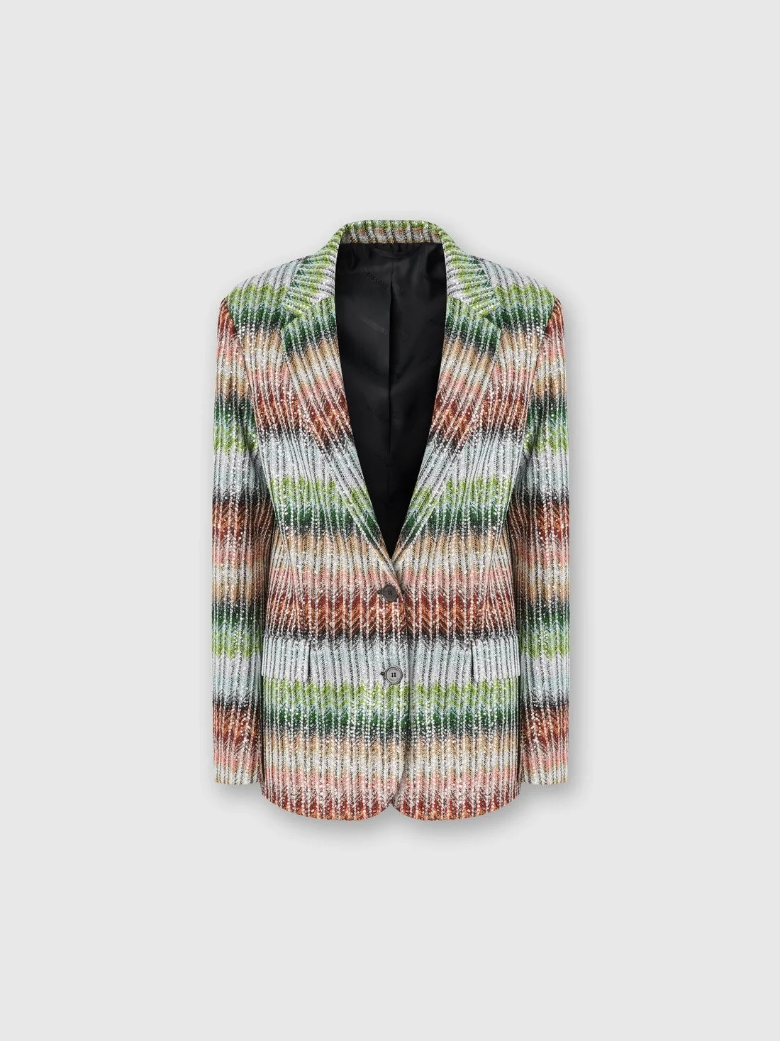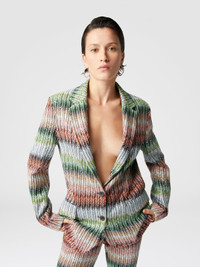 This single-breasted blazer in gradient zigzag knit with sequins combines the simplicity of the shape with sophisticated decoration. The textured Caperdoni workmanship and the reflections of the sequins make the garment a distinctive element, in which the balance between structure and brightness defines contemporary elegance. MORE DETAILS - Single-breasted knit blazer - Degrade zig zag pattern - Decorative Sequins - Carpedoni processing Composition: EXTERNAL:47%Rayon, 26%Polyamide, 20%Polyester, 7%Metal Fiber; INTERNAL REINFORCEMENT:100%Polyester; LINING : 100%Rayon Care instructions: Dry cleaning in tetrachloroethene - mild process ; Do not tumble dry ; Dry flat ; Steam iron only ; Do not iron ; Do not wash ; Do not bleach Made in: Italy Product ID DS25SF02BC0051SM9KP