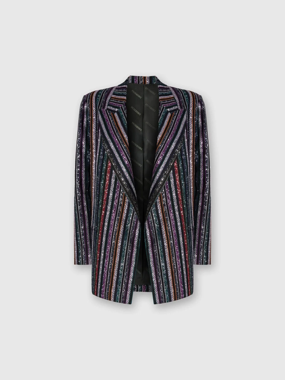 Light and structure meet in this single-breasted women's blazer with defined tailoring, pronounced shoulders, and sharp lapels. The herringbone striped knit, enriched with sequins and lame threads, reflects the spirit of special occasions, making it ideal for eveningwear and standout looks. MORE DETAILS - Single-breasted blazer - Raschel knit - Herringbone stripe knit - Lurex threads and sequins Composition: EXTERNAL:63%Rayon, 20%Metal Fiber, 17%Polyamide; INTERNAL REINFORCEMENT:100%Polyester; LINING : 100%Rayon Care instructions: Dry cleaning in tetrachloroethene - mild process ; Steam iron only ; Do not tumble dry ; Dry flat ; Do not iron ; Do not wash ; Do not bleach Made in: Italy Product ID DS25WF06BK01C3SM9T4