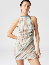 A sleeveless mini-dress that embodies the lively and iconic spirit of Missoni. The striped raschel workmanship is intertwined with lame details, creating a play of light and color. The halter neckline gives a touch of modernity, balanced by the flamed texture that enhances its three-dimensionality. MORE DETAILS - Chevron tank top - Multicolor pattern - Lame filaments - Decorative sequins Composition: EXTERNAL:83%Rayon, 17%Metal Fiber; INTERNAL REINFORCEMENT:100%Polyester Care instructions: Dry cleaning in tetrachloroethene - mild process ; Hand wash ; Do not tumble dry ; Dry flat ; Steam iron only ; Do not iron ; Do not bleach Made in: Italy Product ID DS25SG1TBR002HSM9KR