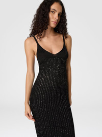 The elegance of this dress takes shape in a long sleeveless design crafted from viscose lame blend with sequins. The V-neckline and tone-on-tone ribbed workmanship enhance the silhouette, while the interplay of light and texture adds movement and refined luminosity to the fabric, turning the piece into a sophisticated interpretation of Missoni style. MORE DETAILS - Women's strapless long dress - Tone-on-tone ribbed knit - Viscose and lame blend with sequins Composition: EXTERNAL:69%Rayon, 19%Polyamide, 12%Metal Fiber; LINING : 82%Polyester, 18%Elastane Care instructions: Ironing maximum temperature 110°C - without steam ; Dry cleaning in tetrachloroethene - mild process ; Do not tumble dry ; Dry flat ; Do not wash ; Do not bleach Made in: Italy Product ID DS26SG0LBK01GHS91RX