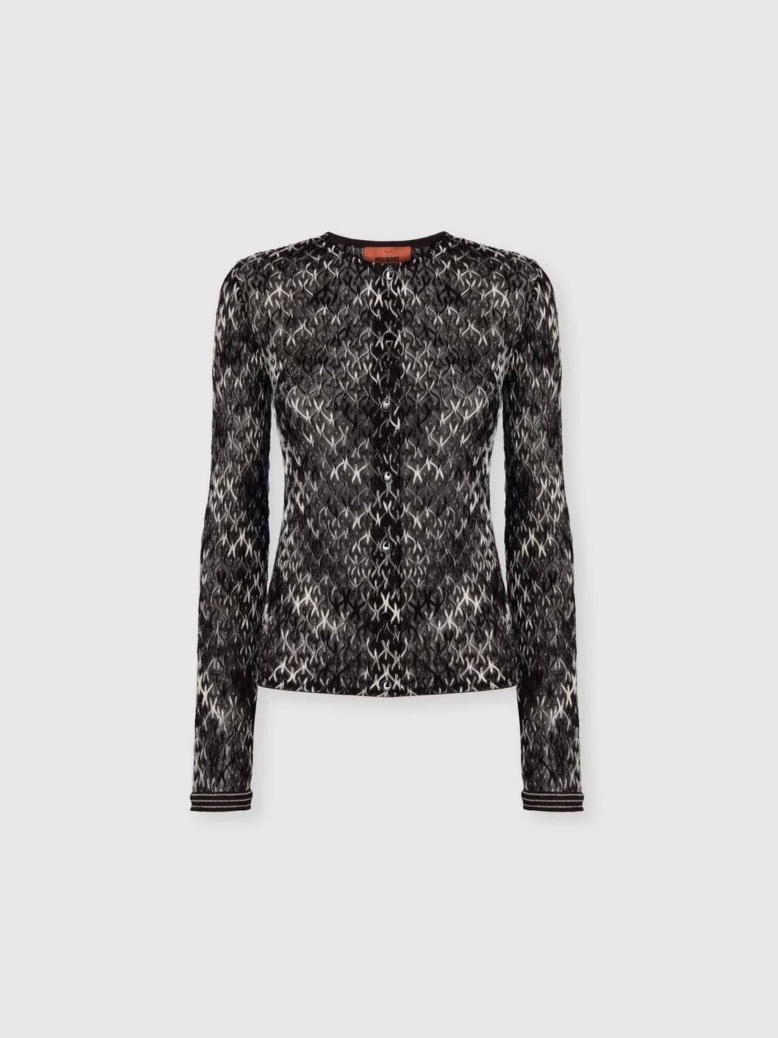 Crew-neck slim cardigan for women with refined charm, enriched by raschel lace in slubbed ribbed pattern that gives the garment a unique and dynamic texture. Made of wool and viscose blend, this cardigan expresses elegance and originality, perfect for a distinctive and sophisticated look. MORE DETAILS - Slim crew neck cardigan - Raschel knit in flame lace - Wool and viscose blend Composition: EXTERNAL:54%Wool, 46%Rayon Care instructions: Hand wash ; Dry cleaning in tetrachloroethene - mild process ; Dry flat ; Steam iron only ; Do not tumble dry ; Do not iron ; Do not bleach Made in: Italy Product ID DS25WM08BR012NS80DO