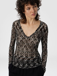 Slim-fit women’s V-neck sweater, made from viscose blend with lame threads. The tonal raschel lacework gives the garment a light and refined elegance, for a feminine look with luminous and sophisticated touches. MORE DETAILS - Slim fit V-neck sweater - Raschel knit in tonal embroidered lace - Viscose blend with lame threads Composition: EXTERNAL:91%Rayon, 9%Metal Fiber Care instructions: Dry cleaning in tetrachloroethene - mild process ; Ironing maximum temperature 110°C - without steam ; Dry flat ; Do not tumble dry ; Do not wash ; Do not bleach Made in: Italy Product ID DS25WN0GBR012HS80DP