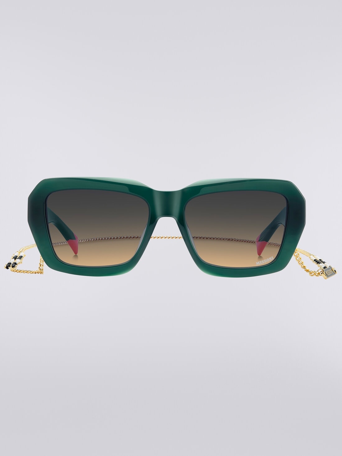 Square acetate sunglasses with a metal chain