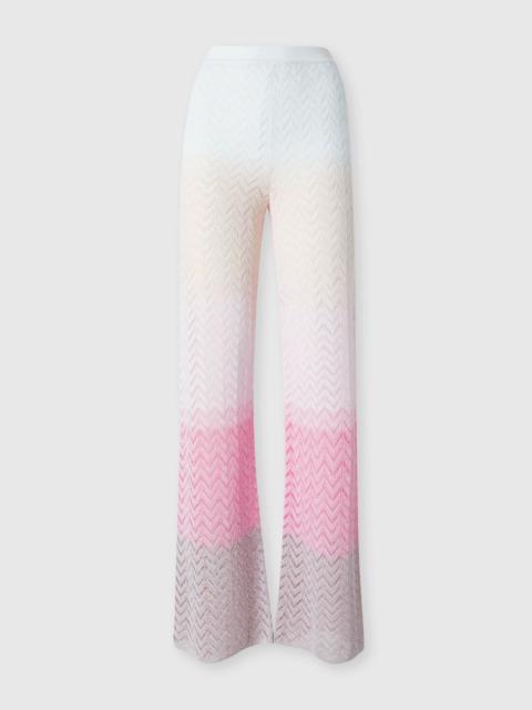 These straight trousers, made of viscose, express all the essence of Missoni's savoir-faire through the gradient chevron motif. Their clean line and chromatic balance make them a garment of great versatility and refinement, perfect for a refined look but without excesses. MORE DETAILS - Crew neck sweater - Chevron Viscose - Gradient vanise chevron pattern - Oversized fit Composition: EXTERNAL:100%Rayon; LINING : 82%Polyester, 18%Elastane Care instructions: Ironing maximum temperature 110°C - without steam ; Dry cleaning in tetrachloroethene - mild process ; Do not tumble dry ; Dry inside out ; Dry flat ; Iron inside out ; Do not wash ; Do not bleach Made in: Italy Product ID DS25SI07BK044XSM9ME