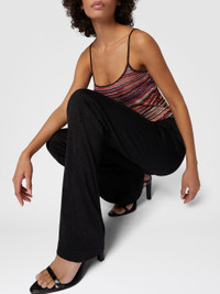 The clean, straight line of these viscose trousers is enhanced with an elegant luminosity, thanks to the lame filaments that run through the fabric. The Missoni house transforms an essential piece into a style statement, combining the fluidity of the material with its traditional craftsmanship. MORE DETAILS - Crew neck sweater - Oversized fit - Short sleeves - Viscose processing - Lame filaments Composition: EXTERNAL:84%Rayon, 12%Metal Fiber, 3%Polyamide, 1%Elastane Care instructions: Ironing maximum temperature 110°C - without steam ; Dry cleaning in tetrachloroethene - mild process ; Do not tumble dry ; Dry flat ; Dry inside out ; Iron inside out ; Do not wash ; Do not bleach Made in: Romania Product ID DS25SI0CBK045AS91NK