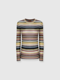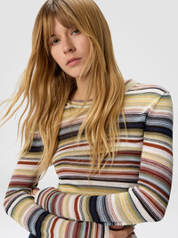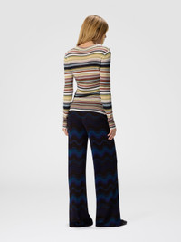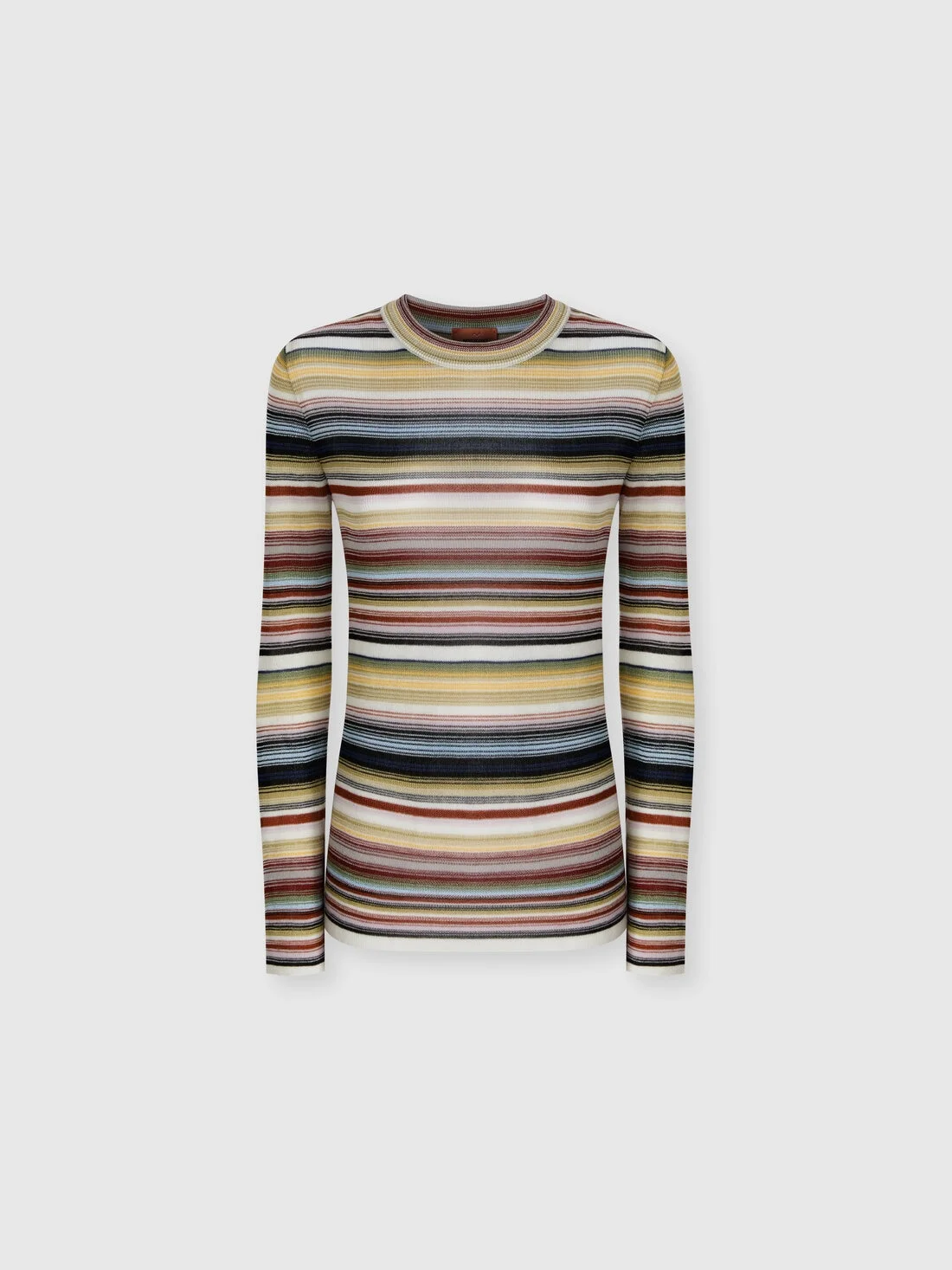 A contemporary reinterpretation of knitwear, designed for those who value both simplicity and personality. This women’s crewneck sweater is crafted in a wool-viscose blend. Its fluid construction reflects Missoni’s craftsmanship, resulting in a piece that fuses comfort, style, and identity into a clean, graphic statement. MORE DETAILS - Women's long sleeve crewneck sweater - Striped pattern - Wool and viscose blend Composition: EXTERNAL:80%Rayon, 20%Wool Care instructions: Hand wash ; Ironing maximum temperature 110°C - without steam ; Wash in net bag ; Dry cleaning in tetrachloroethene ; Dry flat ; Do not tumble dry ; Reshape when damp ; Wash separately ; Do not bleach Made in: Romania Product ID DS25WN2SBK01G0SM9WI