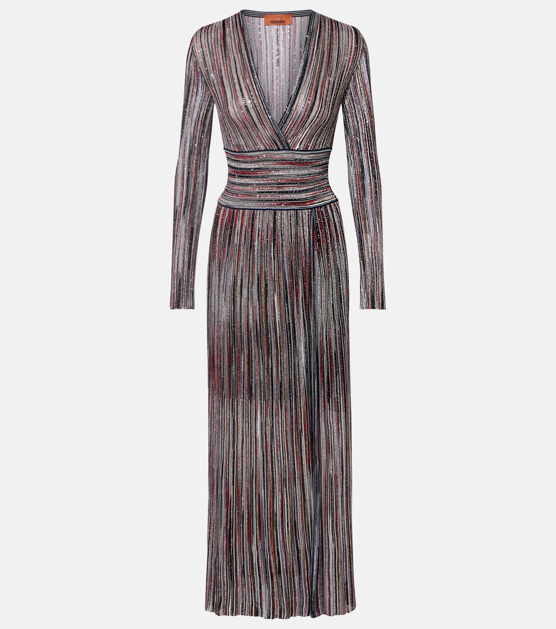 This Missoni maxi dress is a head-turning design for joyful festivities and refined events. Made from shimmering lame, the striped style features a cinched waist and an elegant V-neckline. Product Details - Material: 84% viscose, 15% polyamide, 1% metallic fibres - Care instructions: hand wash - Made in Italy - Designer color name: Dark Base With Red And Blue - Item color: multicolor - Collar: V-neck - Item number: P01108618 Size & Fit - True to size - Cinched waist - Elasticated waist - Stretchy fabric - The model seen in the picture is 178cm-5'10" and wearing a size IT 38