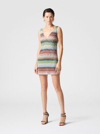 Crafted from gradient zigzag knit embellished with sequins, this short dress embodies the mastery of the textured Caperdoni motif. The deep V-neck and open back enhance the femininity of the design, while the metallic reflections of the lame and the play of sequins add a note of sophisticated luminosity. MORE DETAILS - Short knit dress - V-neck - Backless - Degrade zig zag pattern - Decorative sequinsCaperdoni motif Composition: EXTERNAL:47%Rayon, 26%Polyamide, 20%Polyester, 7%Metal Fiber; LINING : 100%Polyester Care instructions: Hand wash ; Dry cleaning in tetrachloroethene - mild process ; Dry flat ; Do not tumble dry ; Steam iron only ; Do not iron ; Do not bleach Made in: Italy Product ID DS25SG1DBC0051SM9KP