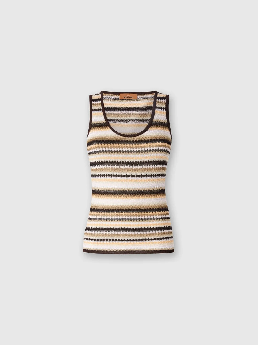 The versatility of the cotton and viscose mix provides the ideal terrain for the discontinuous striped background of the knitted tank top. The fitted style with a round neckline is finished with contrasting piping. MORE DETAILS - Tank top with round neckline - Striped cotton and viscose sweater - Contrasting profiles Composition: EXTERNAL:50%Cotton, 50%Rayon Care instructions: Ironing maximum temperature 110°C - without steam ; Hand wash ; Dry cleaning in tetrachloroethene - mild process ; Do not tumble dry ; Dry flat ; Do not bleach Made in: Italy Product ID DS24WK0LBK039XSM9GH
