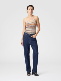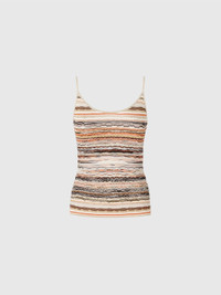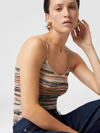 A tank top that embodies Missoni's savoir-faire, crafted from embossed viscose and decorated with the maison's unmistakable wave motif. The light and luminous fabric creates, thanks to the lame, an iridescent effect, perfect for enhancing any look with refinement. A versatile garment, which encapsulates the elegance and craftsmanship innovation of Missoni. MORE DETAILS - Striped crochet - Embossed viscose lame - Wave pattern Composition: EXTERNAL:78%Rayon, 19%Metal Fiber, 2%Polyamide, 1%Elastane Care instructions: Ironing maximum temperature 110°C - without steam ; Dry cleaning in tetrachloroethene - mild process ; Dry flat ; Do not tumble dry ; Iron inside out ; Dry inside out ; Do not wash ; Do not bleach Made in: Romania Product ID DS25SK07BK042CS01G4