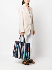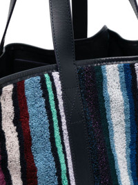 dark blue/multicolour cotton blend terry-cloth effect metallic threading vertical stripe print two top handles open top main compartment internal logo patch multiple internal slip pockets The item you receive may differ slightly from the item photographed. This is due to the artisanal nature with which all Missoni products are constructed. This piece comes complete with a protective dust bag. Size & Fit Model Measurements: Bust: 87cm Height: 179cm Hips: 94cm Waist: 63cm DEPTH: 19cm HANDLE: 18cm HEIGHT: 40cm WIDTH: 42cm Fabric and Care Designer Style ID: 1C3OG00031 Designer Colour: 150 - BLUE Composition: Outer: Metallic fibre 3%, Cotton 82%, Viscose 15%Made in Italy