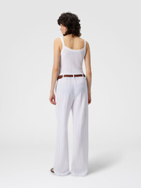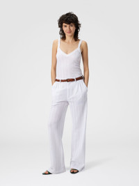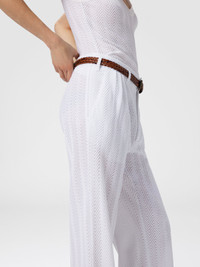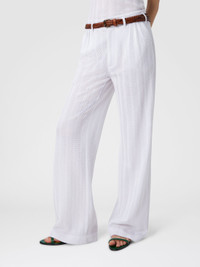 A tailored women’s trouser that reinterprets the iconic Missoni zigzag pattern with elegance, presented in a tone-on-tone version through refined raschel workmanship. Made from a cotton blend, it combines structure and graphic identity in a distinctive piece with a contemporary taste. MORE DETAILS - Tailored pants - Raschel zig zag knit - Cotton blend Composition: EXTERNAL:74%Cotton, 26%Rayon Care instructions: Wash max 30°C ; Dry cleaning in tetrachloroethene - mild process ; Steam iron only ; Do not tumble dry ; Dry flat ; Do not iron ; Do not bleach Made in: Italy Product ID DS25WI01BR00JC10601