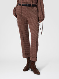 A tapered women’s trouser with cuff that blends elegance and structure, made from ribbed raschel lace. The wool and viscose blend gives the piece a rich and refined texture, for a sophisticated look with a hint of originality. MORE DETAILS - Tapered fit pants with cuff - Raschel ribbed lace-effect knit - Wool and viscose blend Composition: EXTERNAL:54%Wool, 46%Rayon; INTERNAL REINFORCEMENT:100%Polyester Care instructions: Hand wash ; Dry cleaning in tetrachloroethene - mild process ; Do not tumble dry ; Dry flat ; Steam iron only ; Do not iron ; Do not bleach Made in: Italy Product ID DS25WI0UBR012J81314