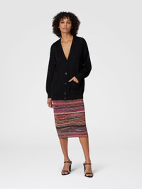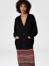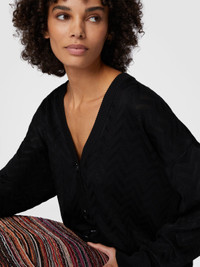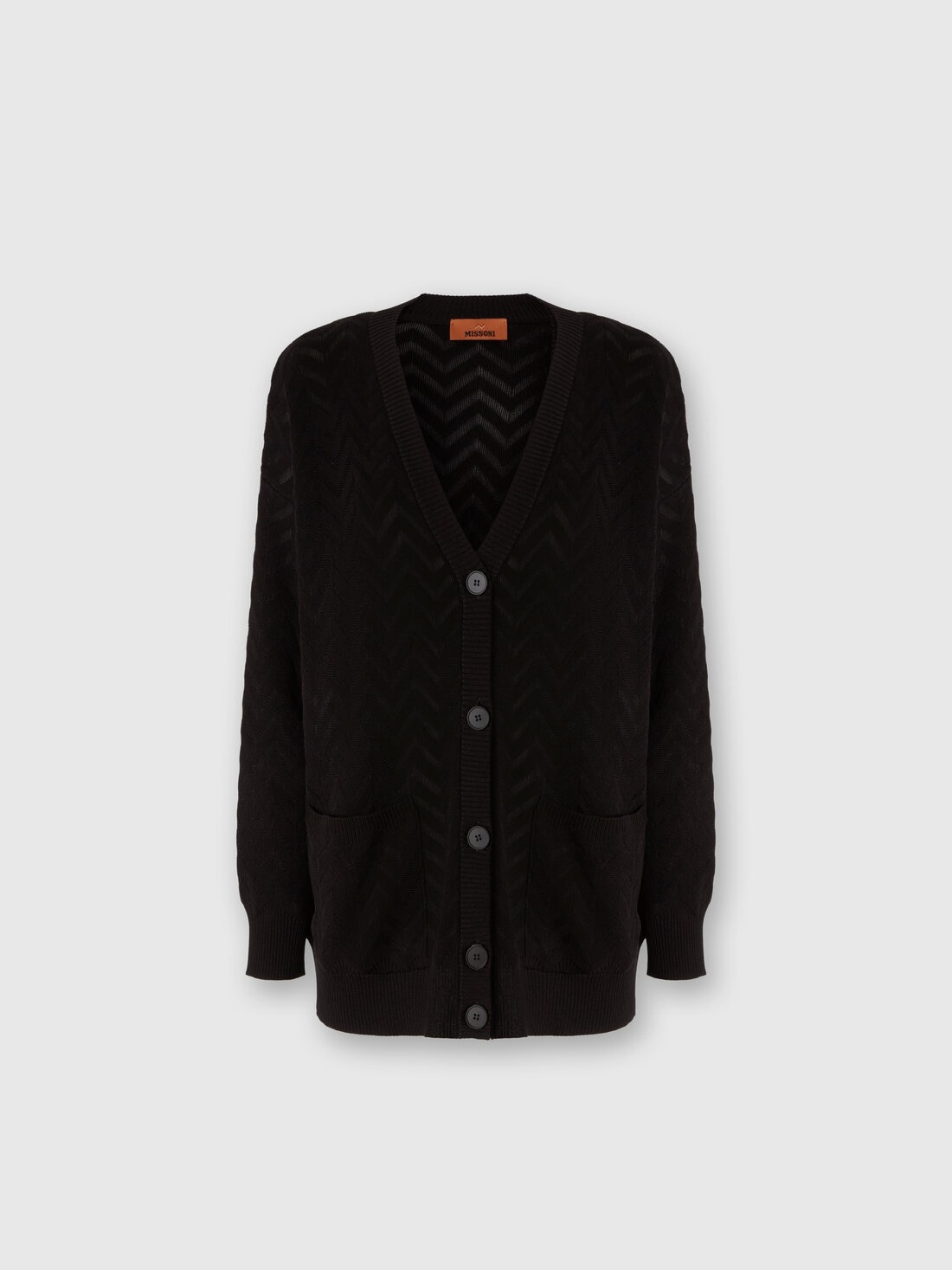Expertly crafted in jacquard, this oversized cardigan combines a tonal chevron motif with details such as matching buttons. The loose fit and soft texture make the garment versatile, perfect for completing any look with relaxed elegance. MORE DETAILS - Jacquard chevron pattern - Tone-on-tone buttons - Oversized fit - Missoni processing Composition: EXTERNAL:61%Cotton, 37%Rayon, 1%Elastane, 1%Polyamide Care instructions: Dry cleaning in tetrachloroethene - mild process ; Ironing maximum temperature 110°C - without steam ; Dry flat ; Iron inside out ; Dry inside out ; Do not tumble dry ; Do not wash ; Do not bleach Made in: Italy Product ID DS25SM06BK044U93911