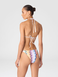 With a graphic and bold design, this triangle bikini with tassels for women is made with raschel workmanship and features a print of shaded micro and macro stripes on a zigzag background, an iconic style code of Missoni. A garment full of personality, designed for those who want a distinctive and vibrant look. MORE DETAILS - Triangle bikini with tassels - Raschel knit with shaded macro and micro stripe pattern - Zigzag background Composition: EXTERNAL:100%Polyester; Sewing thread:100%Polyester; INSERTS:60%Rayon, 40%Metal; LINING : 80%Polyamide, 20%Elastane Care instructions: Hand wash ; Do not tumble dry ; COOL HAND WASH ; Do not dry clean ; Do not iron ; Do not bleach Made in: Italy Product ID MC25WP00BR013XSM9UC