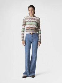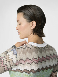 The irregular snake motif takes shape on this women’s crew-neck sweater in viscose lame, embellished with contrasting trims and sophisticated raschel workmanship that accentuates its luminosity. MORE DETAILS - Women's crewneck sweater - Contrasting trims - Raschel knit - Snake pattern - Viscose lame Composition: EXTERNAL:83%Rayon, 17%Metal Fiber Care instructions: Hand wash ; Ironing maximum temperature 110°C - without steam ; Do not tumble dry ; Dry flat ; do not soak ; Do not dry clean ; Cool Hand Wash ; Do not bleach Made in: Italy Product ID DS26SN0SBR014WSM9Y3