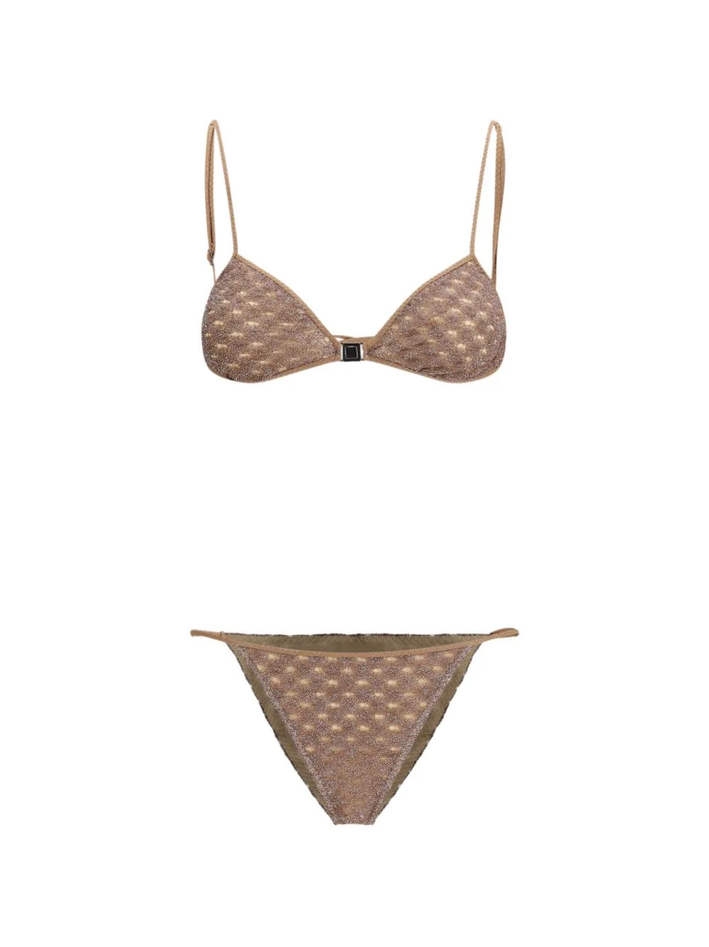 polka-dot bikini Highlights - Light brown - Polka-dot pattern - Triangle cup - Adjustable straps - Clasp fastening - Brief bottoms - The item you receive may differ slightly from the item photographed. this is due to the artisanal nature with which all missoni products are constructed. - Be mindful to try on swimwear over your own garments. Made in Italy Composition Outer: Rayon 87%, Metallic Fibre 13% Lining: Polyamide 80%, Elastane 20% Washing instructions Hand Wash
