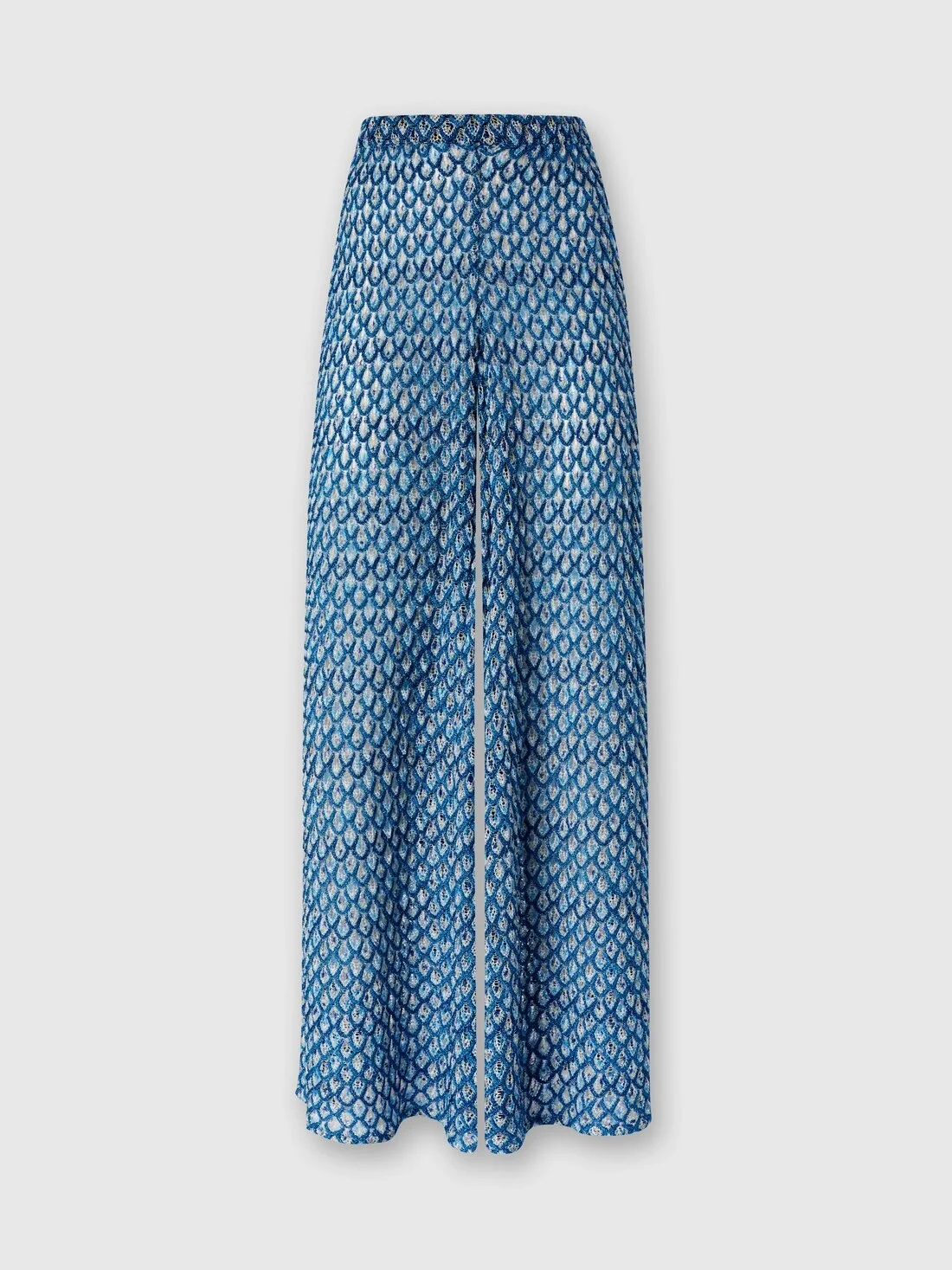 Viscose palazzo trousers with shell motif and lame accents. The wide and fluid silhouette combines with the decorative texture, creating a refined and luminous visual effect, perfect for a contemporary and elegant look. MORE DETAILS - Triangle bikini - Viscose processing - Shell Pattern - Lame filaments Composition: EXTERNAL:78%Rayon, 22%Metal Fiber Care instructions: Ironing maximum temperature 110°C - without steam ; Dry cleaning in tetrachloroethene ; Do not tumble dry ; Do not wash ; Do not bleach Made in: Italy Product ID MC23SI00BR011ZS72KA