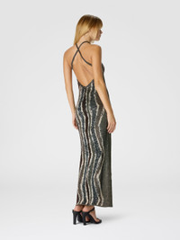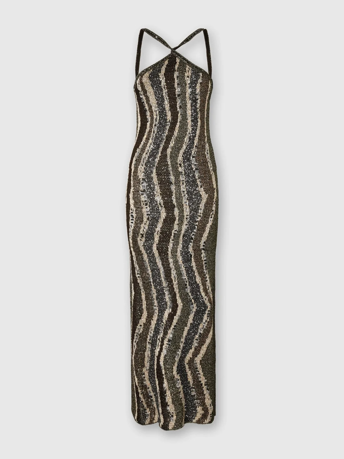 Light becomes the protagonist in this long Missoni dress, where lame threads and sequins weave through a refined wave pattern. The jacquard knit gives depth and motion to the fabric, while the halter neckline emphasizes the shoulders—offering a feminine and sophisticated allure. MORE DETAILS - Long dress - Halter neckline - Wave motif - Jacquard knit - Lurex threads and sequins Composition: EXTERNAL:53%Polyamide, 40%Rayon, 7%Metal Fiber; LINING : 82%Polyester, 18%Elastane Care instructions: Dry cleaning in tetrachloroethene - mild process ; Ironing maximum temperature 110°C - without steam ; Wash in net bag ; Iron inside out ; Do not tumble dry ; Dry inside out ; Dry flat ; Do not wash ; Do not bleach Made in: Italy Product ID DS25WG0KBK01C8S80E2