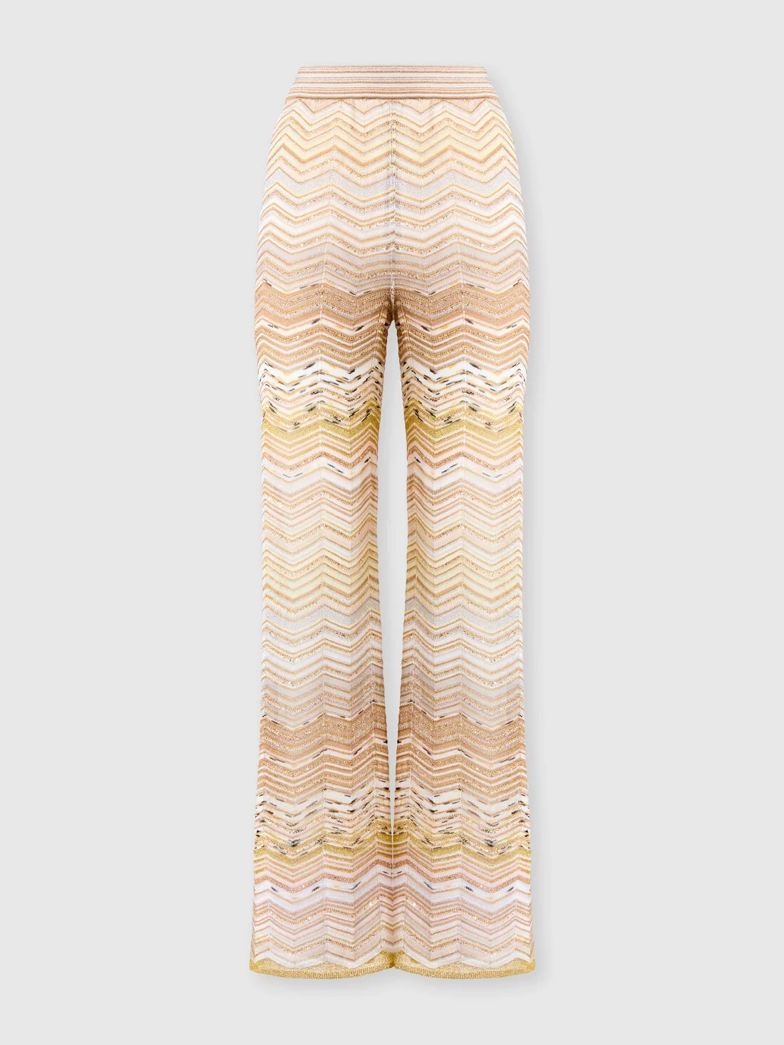 Wide-leg women’s trousers crafted from chevron lame viscose with sequin embellishment and an elasticated waistband. A piece that blends radiance and comfort, expressing Missoni’s refined artisanal craftsmanship. MORE DETAILS - Women’s wide-leg trousers - Elastic waistband - Chevron lame viscose - Sequin detailing Composition: EXTERNAL:76%Rayon, 13%Metal Fiber, 11%Polyamide; LINING : 82%Polyester, 18%Elastane Care instructions: Dry cleaning in tetrachloroethene - mild process ; Ironing maximum temperature 110°C - without steam ; Dry flat ; Do not tumble dry ; Do not wash ; Do not bleach Made in: Italy Product ID DS26SI0CBK01H9SM9ZU