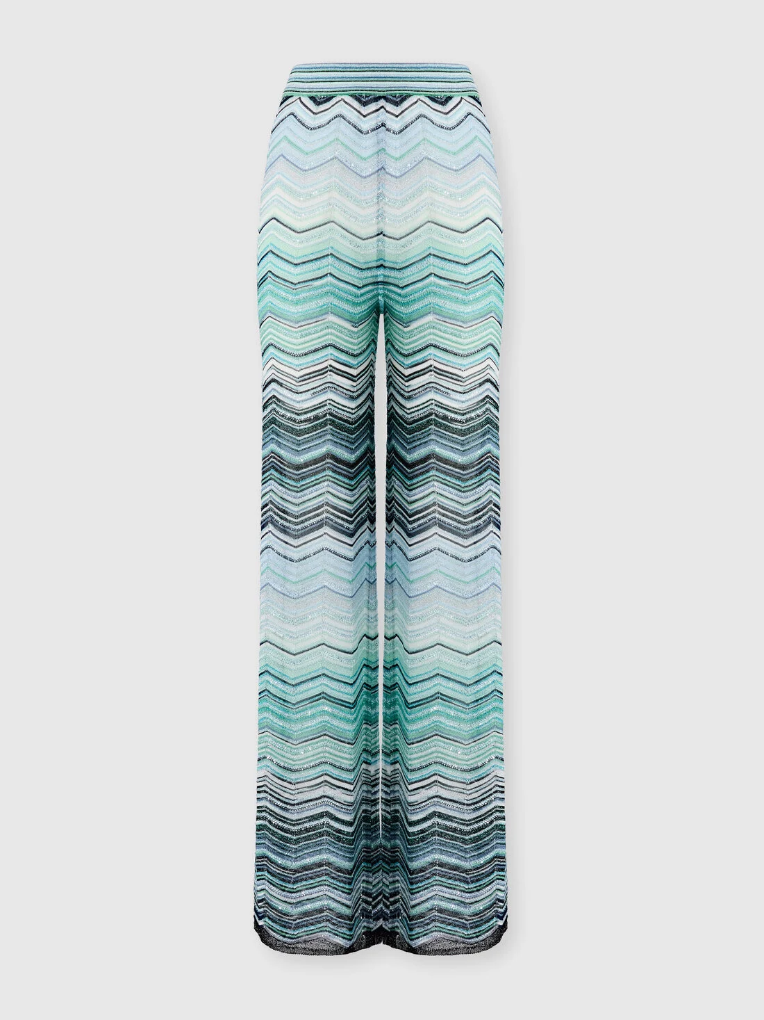 Wide-leg women’s trousers crafted from chevron lame viscose with sequin embellishment and an elasticated waistband. A piece that blends radiance and comfort, expressing Missoni’s refined artisanal craftsmanship. MORE DETAILS - Women’s wide-leg trousers - Elastic waistband - Chevron lame viscose - Sequin detailing Composition: EXTERNAL:76%Rayon, 13%Metal Fiber, 11%Polyamide; LINING : 82%Polyester, 18%Elastane Care instructions: Dry cleaning in tetrachloroethene - mild process ; Ironing maximum temperature 110°C - without steam ; Dry flat ; Do not tumble dry ; Do not wash ; Do not bleach Made in: Italy Product ID DS26SI0CBK01H9SMSN4