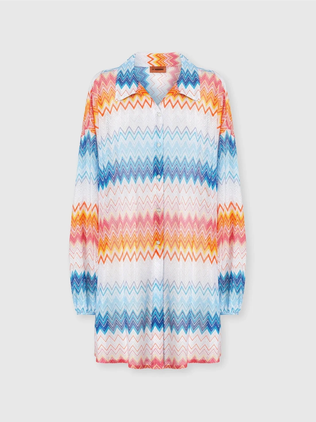 The oversized viscose-blend shirt with a gradient zigzag pattern reinterprets Missoni's aesthetic codes in a contemporary way. The wide, flowing construction offers a modern, relaxed silhouette, while the light and luminous fabric, enriched with the reflections of lame, adds a touch of sophistication. A versatile and sophisticated garment that combines tradition and innovation with the unmistakable Missoni style. MORE DETAILS - Oversized Shirt - Viscose and lame blend - Zig zag pattern Composition: EXTERNAL:90%Rayon, 6%Polyester, 4%Polyamide Care instructions: Ironing maximum temperature 110°C - without steam ; Dry cleaning in tetrachloroethene ; Do not tumble dry ; Do not wash ; Do not bleach Made in: Italy Product ID MC24SK00BR00ZYSM9MW