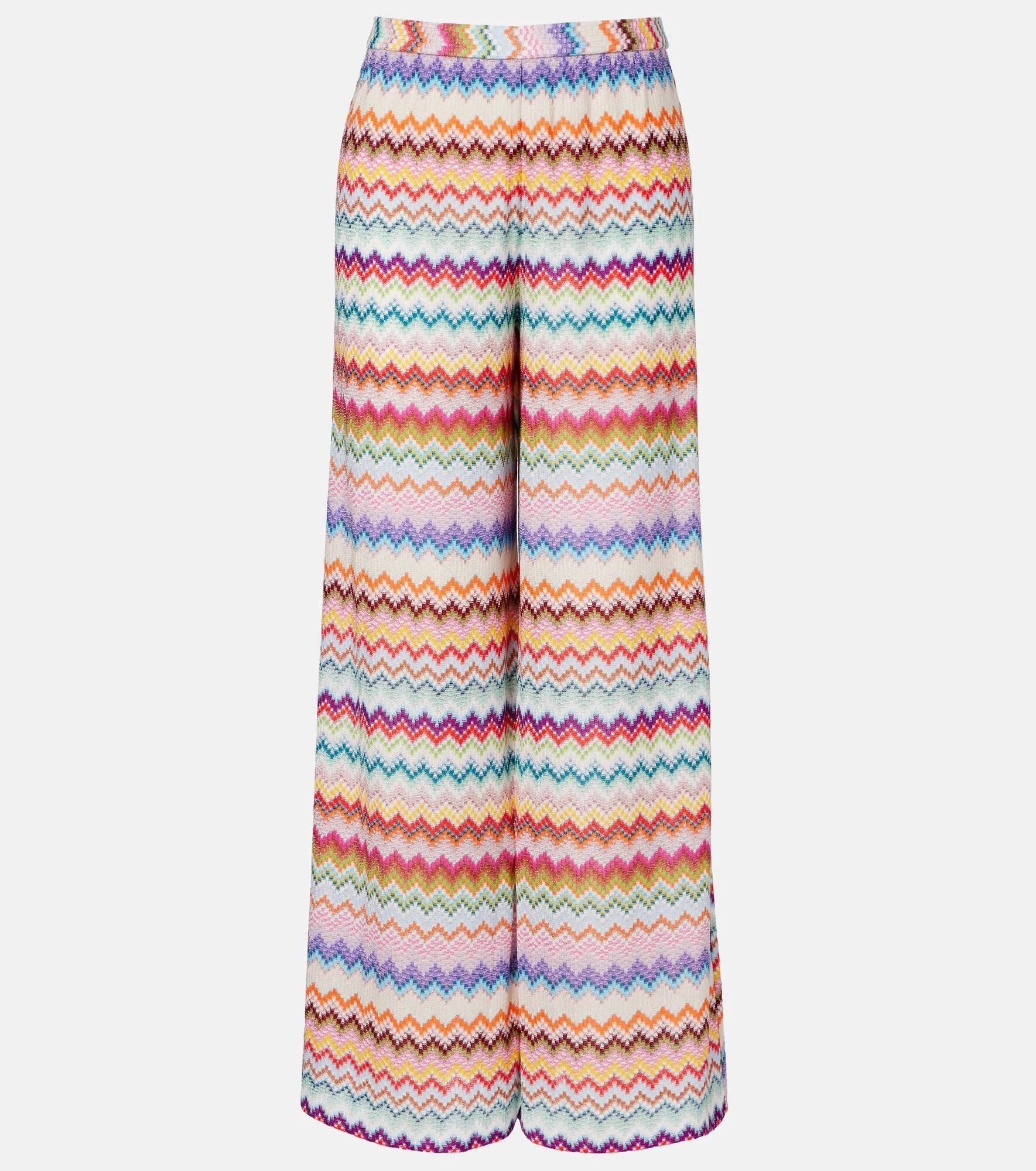 Missoni's iconic Zig Zag pattern was first introduced in the 1950s and is now a symbol of Italian luxury. These palazzo pants are crafted from lame and showcase the signature pattern in bright hues. Product Details - Material: 83% viscose, 17% metallic fibres - Care instructions: dry clean - Made in Italy - Designer color name: Multicolor W/Light Base - Item color: multicolor - Elasticated waistband - Item number: P01107544